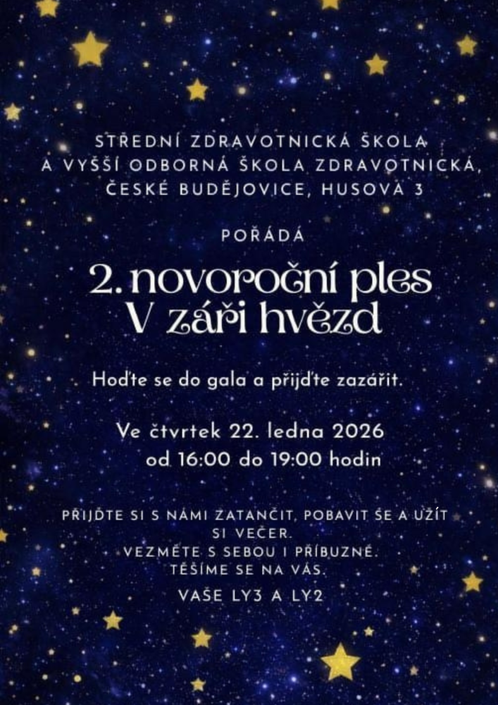 Dne 22. 1. 2026 uspořádali žáci 2. a 3. ročníku oboru Zdravotnické lyceum pro Centrum sociálních služeb Staroměstská v Českých Budějovicích 2. novoroční ples V záři hvězd.