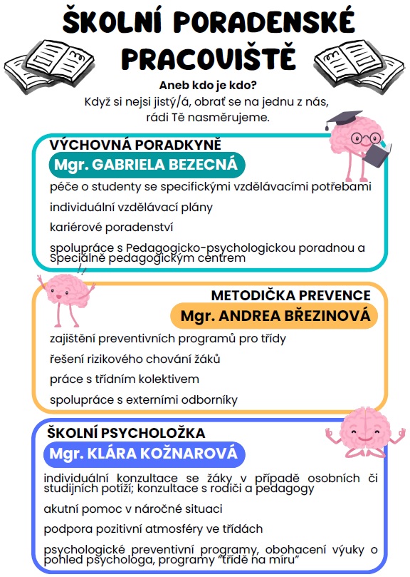 - Výchovný a kariérový poradce – Mgr. Gabriela Bezecná, 387 023 031, bezecna@szscb.cz